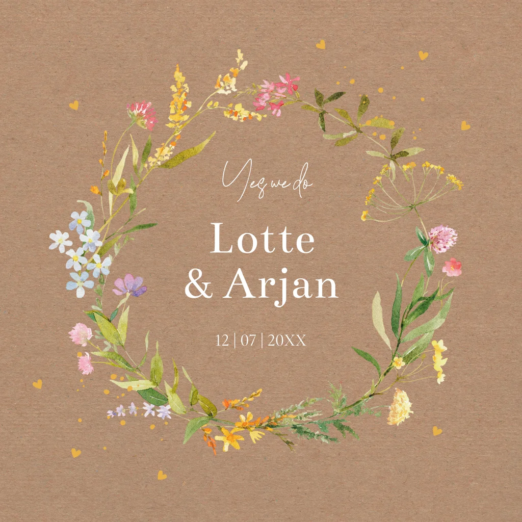 Trouwkaart kraft bloemenkrans geel goudfolie