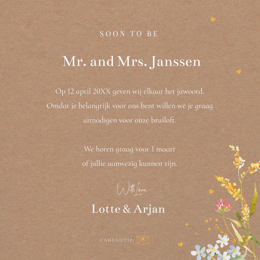 Stijlvolle trouwkaart kraftlook met veldbloemen geel en goudfolie. Pas de kleuren naar wens aan! In de binnenkant van de kaart is ruimte voor een foto en staan leuke trouwsymbolen.