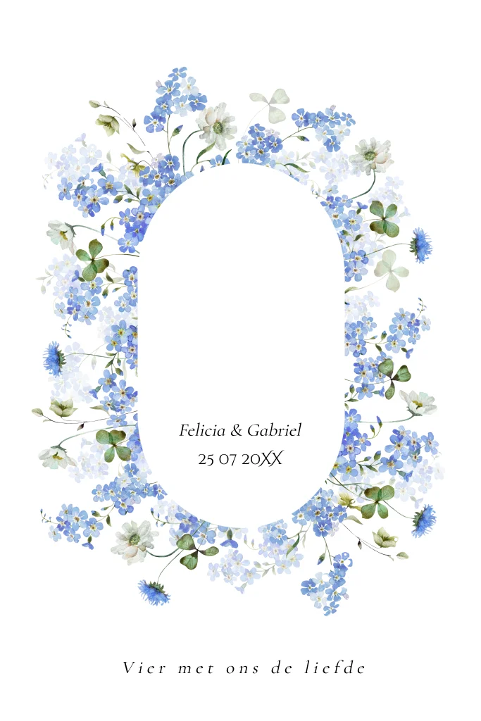 Landelijke trouwkaart rechthoekig wit met krans van bloemen blauw in boog vorm met goudfolie.