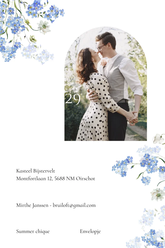Trouwkaart landelijk wit bloemen blauw boog goudfolie