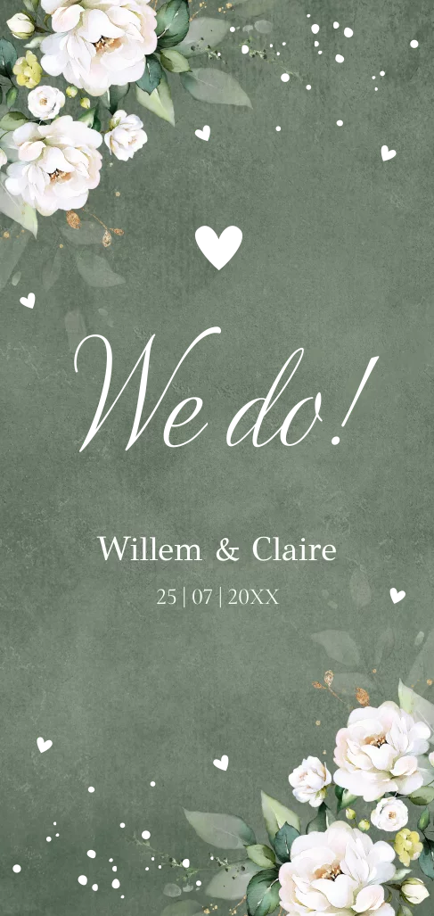 Trouwkaart langwerpig groen botanisch met witte bloemen en goudfolie.
