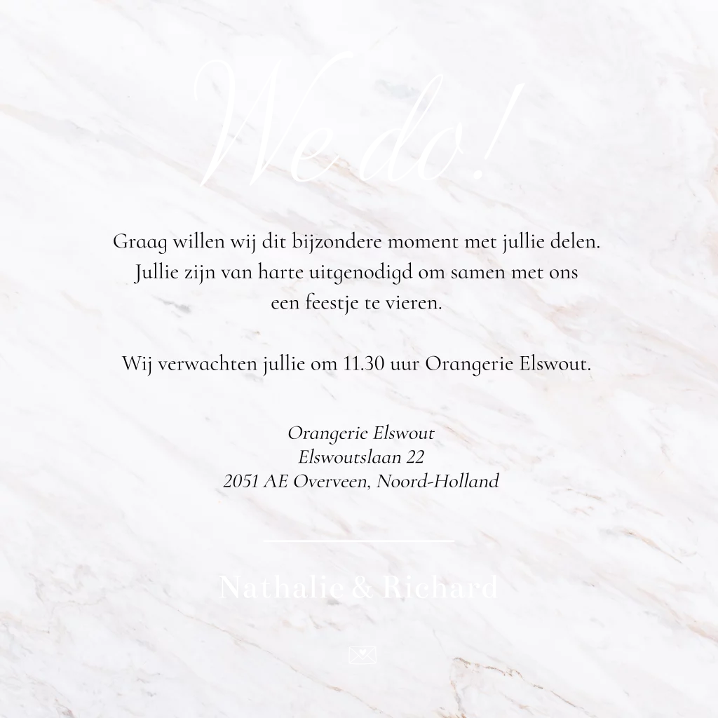 Stijlvolle trouwkaart vierkant wit met marmerlook en goudfolie.
