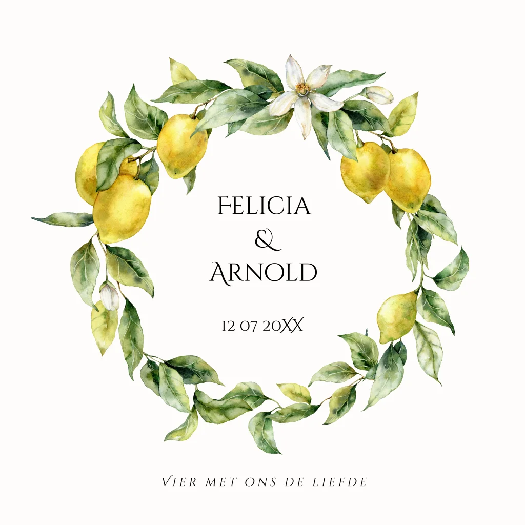 Mooie trouwkaart met citroenen in mediterraanse stijl. In de binnenkant is ruimte voor een foto en staan leuke trouw symbolen.