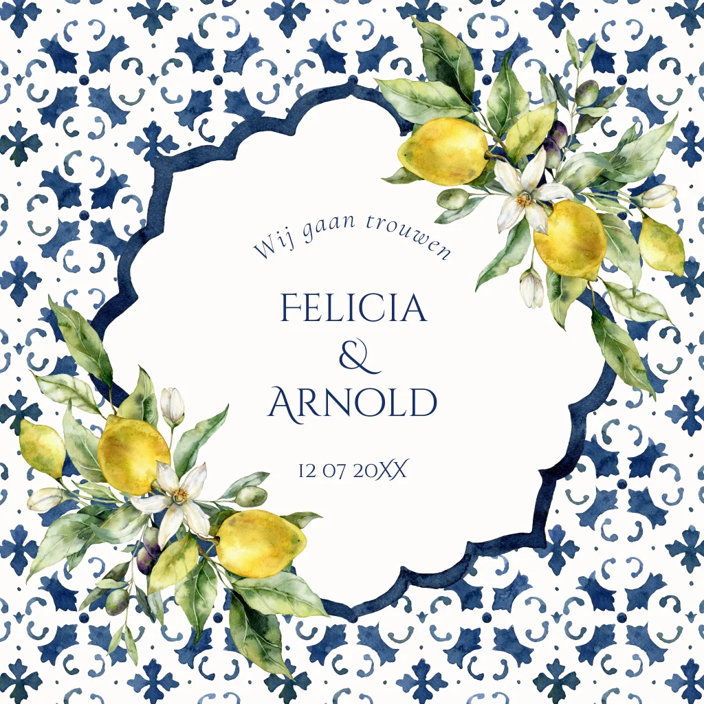 Trouwkaart Mediterraans citroenen geel patroon blauw