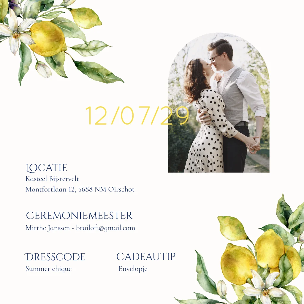 Mooie trouwkaart met citroenen in mediterraanse stijl. In de binnenkant is ruimte voor een foto en staan leuke trouw symbolen.