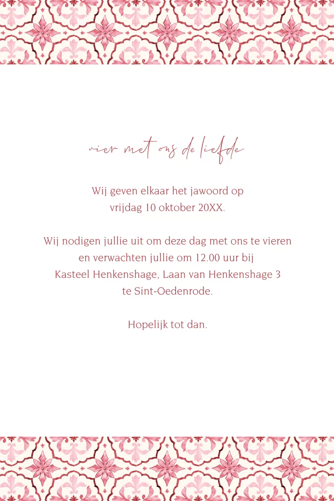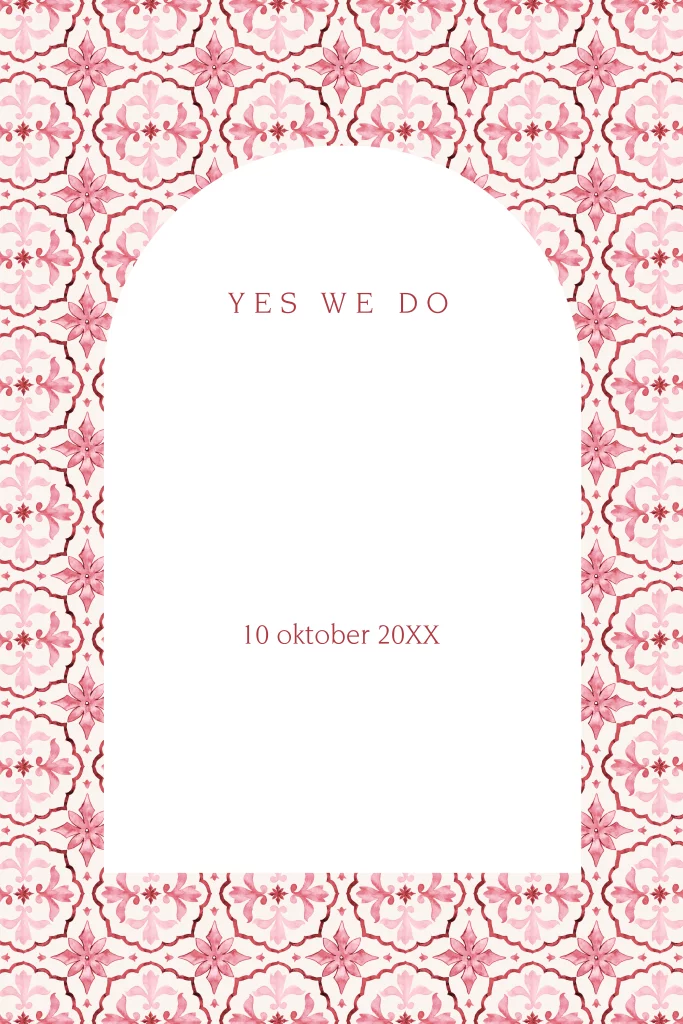 Prachtige trouwkaart met mediterraans patroon roze. Deze exclusieve trouwkaart wordt bedrukt met jullie namen en kader, trouwringen in goudfolie. In de binnenkant staan mooie trouw symbooltjes in goudfolie. Personaliseer de kaart naar eigen smaak met behulp van onze handige editor.