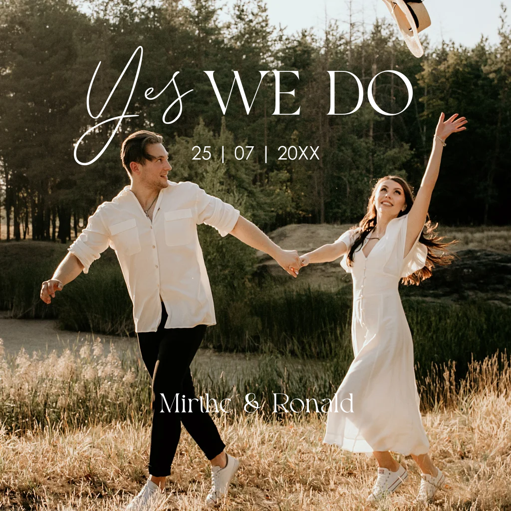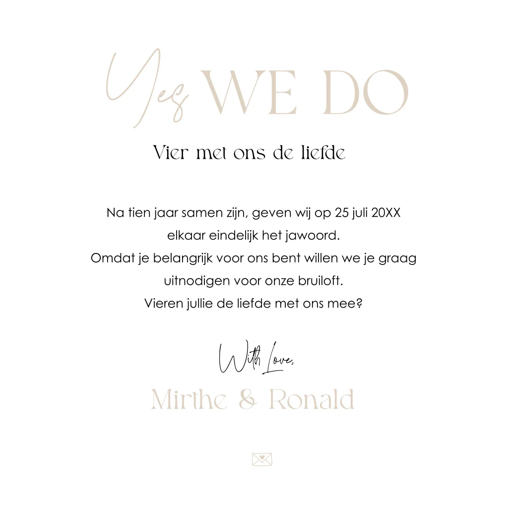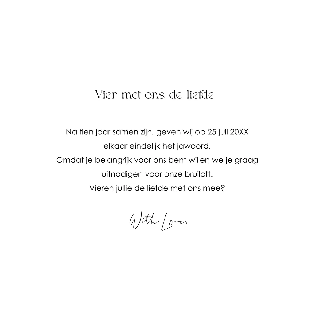 Een prachtige kaart met eigen foto om jullie grote dag mee aan te kondigen aan vrienden en familie. Nodig jullie gasten uit met deze persoonlijke trouwkaart!