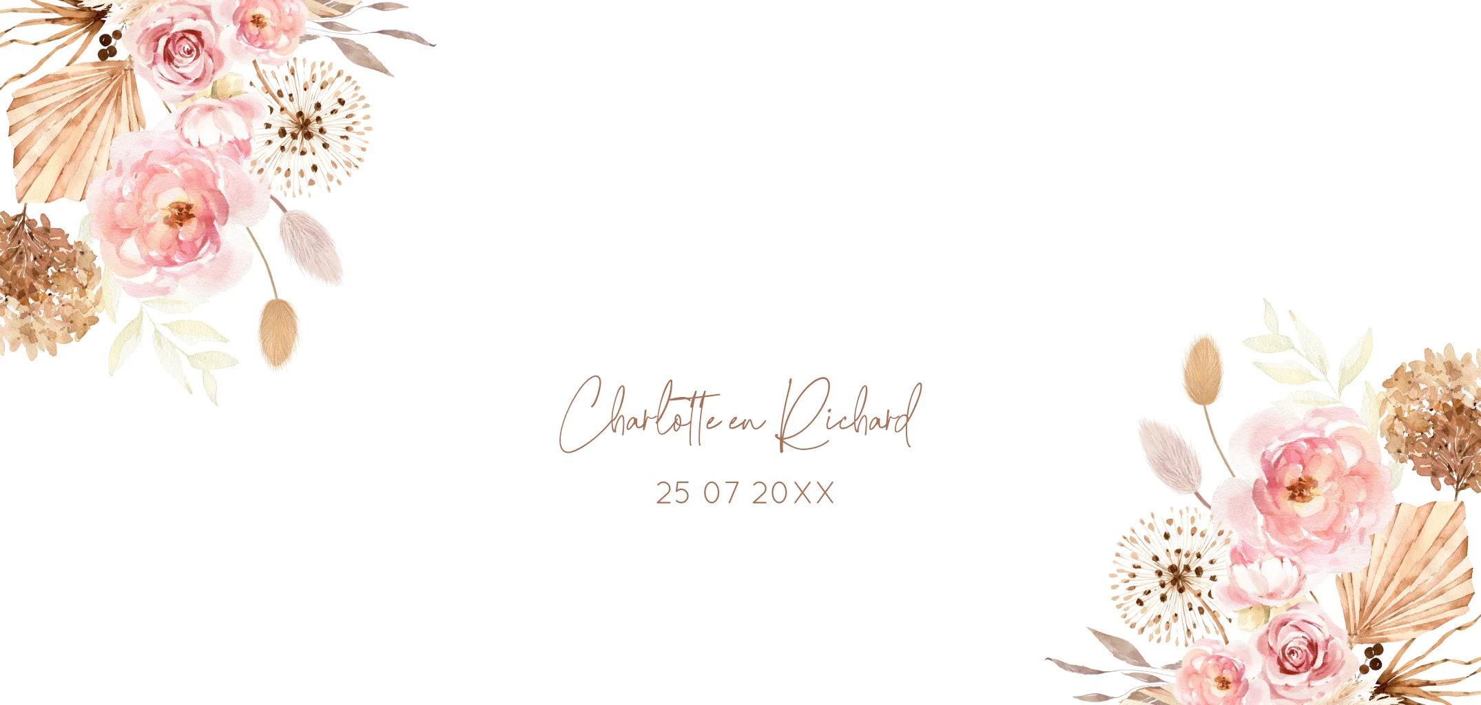 Trouwkaart panorama met bohemian bloemen roze en goudfolie.