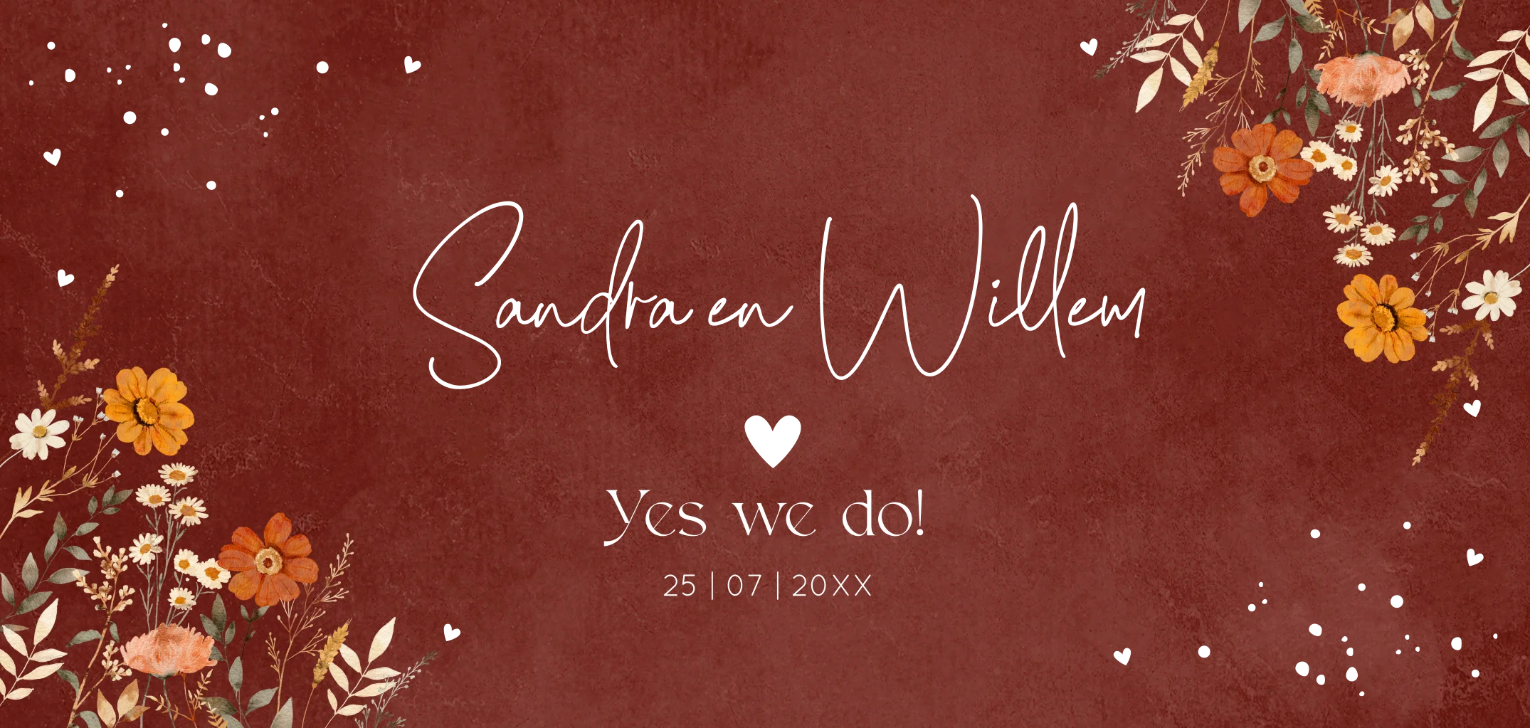 Trouwkaart rood bruin bloemen goudfolie panorama