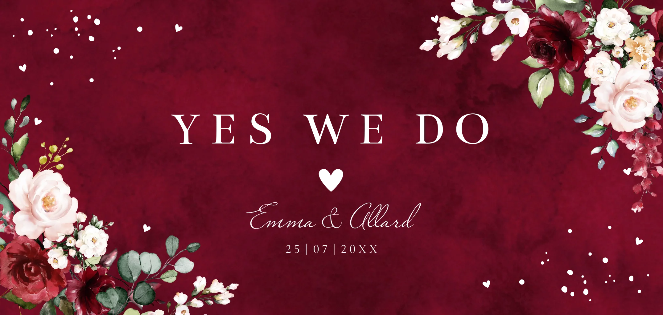 Trouwkaart panorama rood met romantische bloemen en goudfolie.