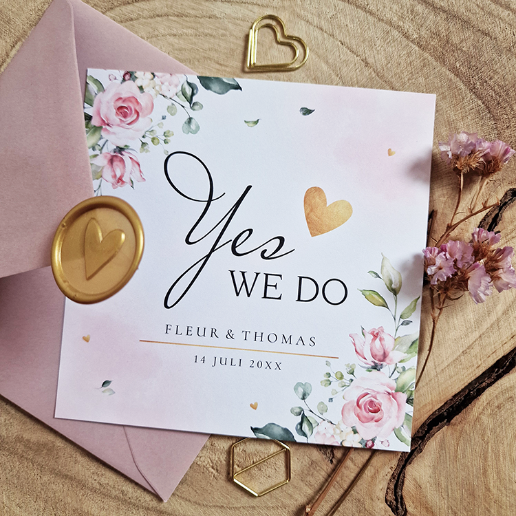 Romantische trouwkaart met roze bloemen en groene bladeren. Nodig jullie gasten uit met deze mooie trouwkaart.