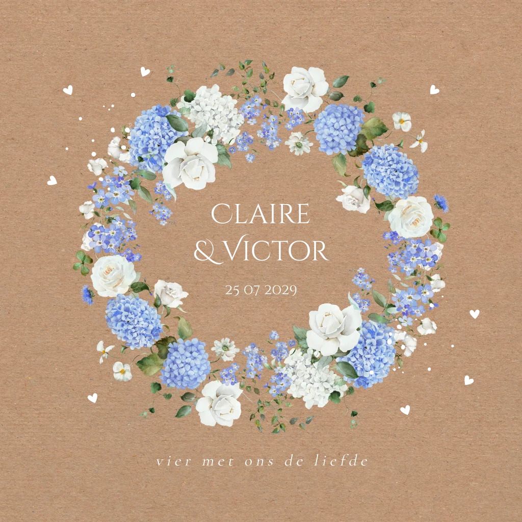 Trouwkaart landelijk bloemen blauw wit kraftlook goudfolie