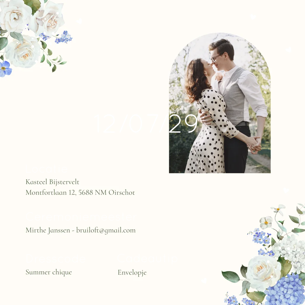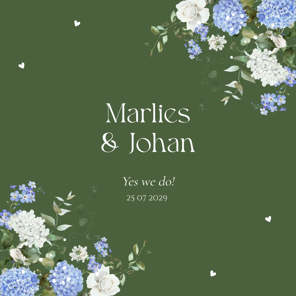 Landelijke trouwkaart vierkant groen met bloemen blauw en goudfolie. Kies deze prachtige originele trouwkaart voor jullie bruiloft!