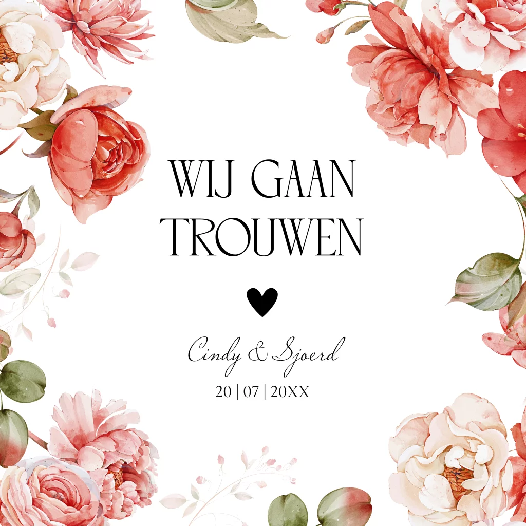 Trouwkaart vierkant dubbel met romantische watercolour bloemen rood.
