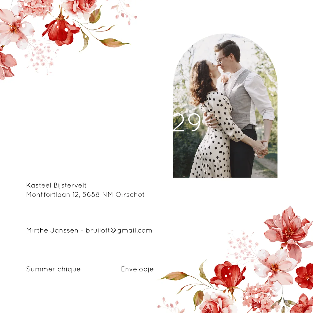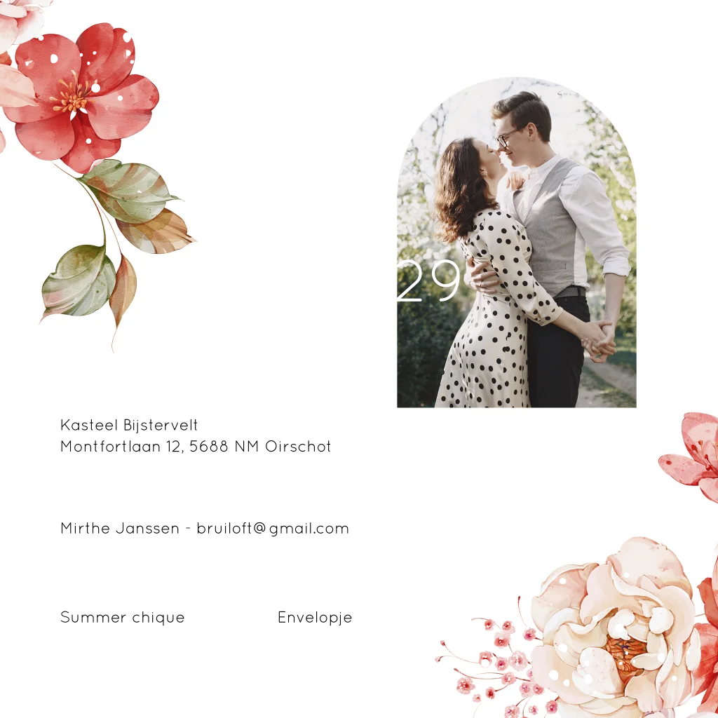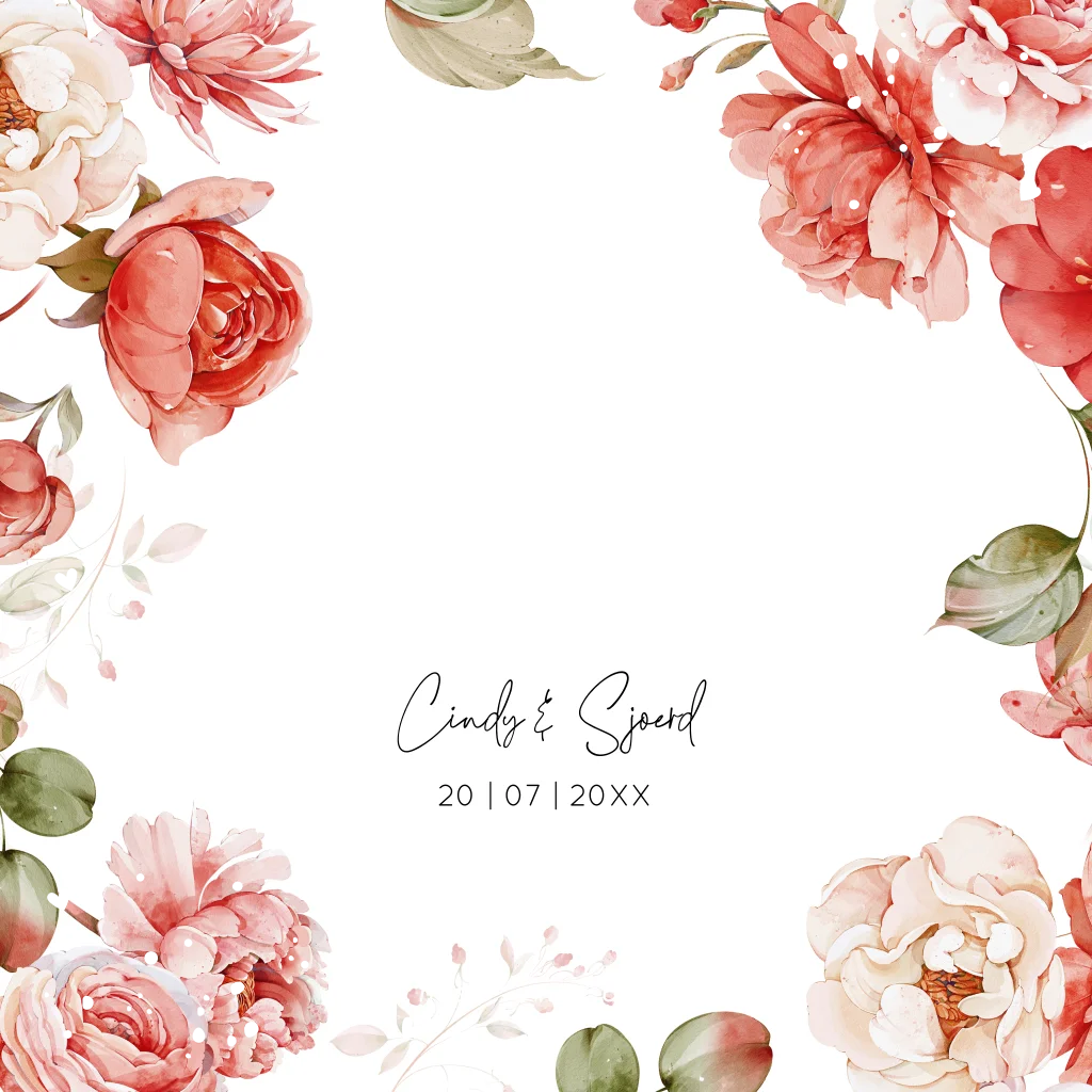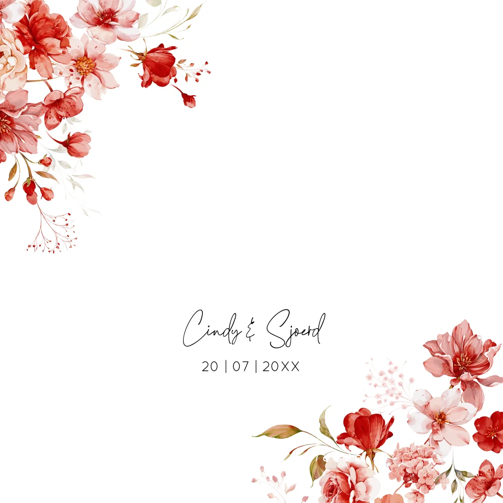 Stijlvolle trouwkaart vierkant dubbel met romantische watercolour bloemen rood en luxe goudfolie.