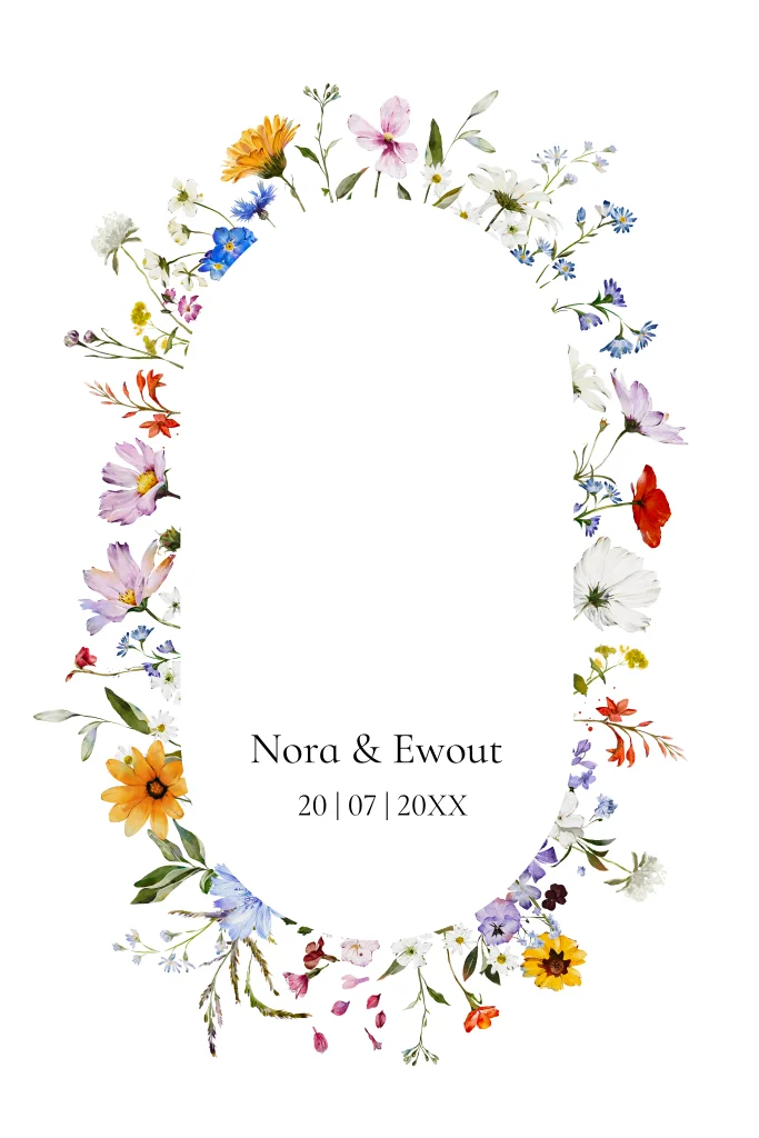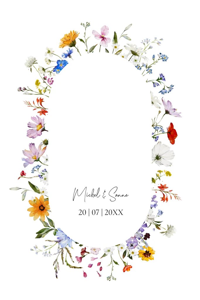 Stijlvolle trouwkaart wit met zomerse bloemenkrans in verschillende kleuren met goudfolie. Nodig jullie gasten uit met deze prachtige romantische trouwkaart met bloemen!