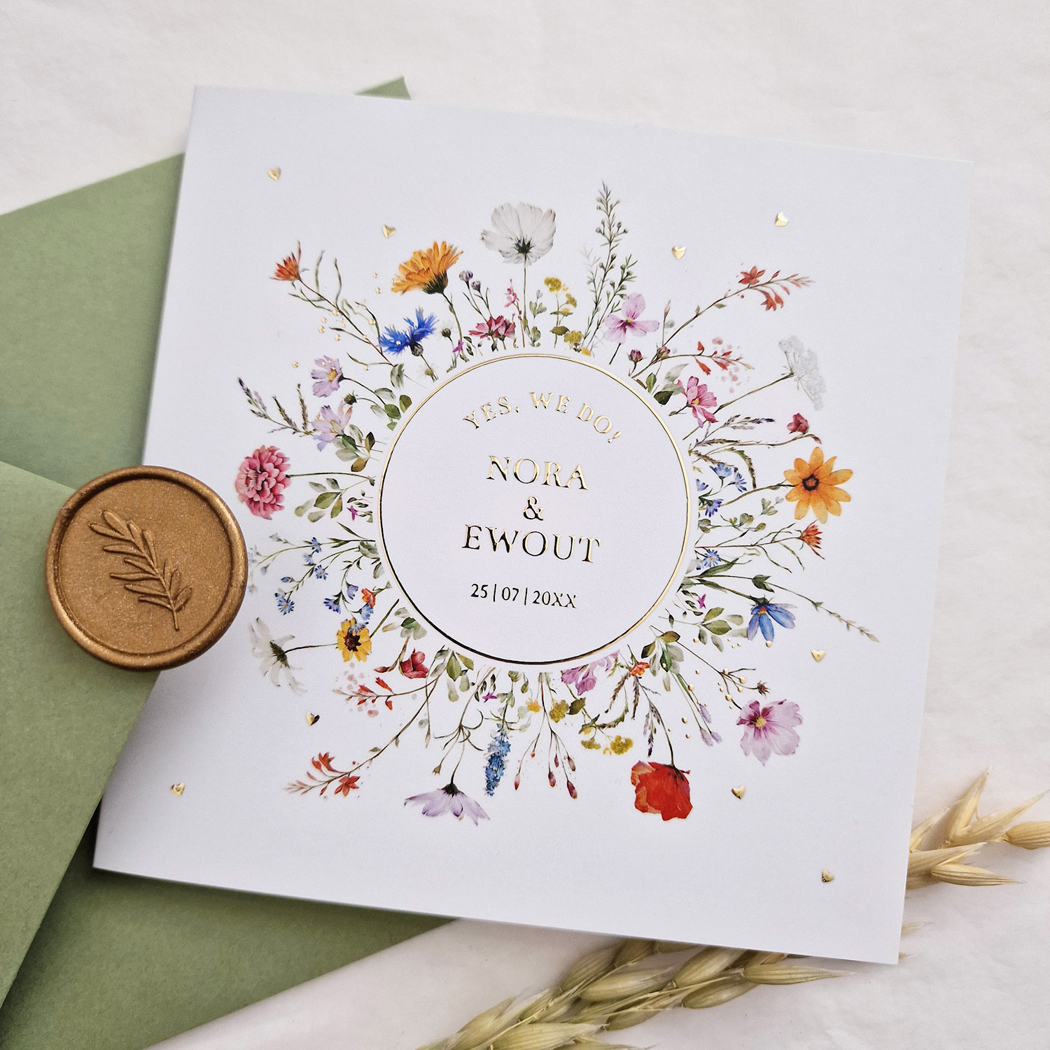 Trouwkaart wit zomerse bloemen krans goudfolie