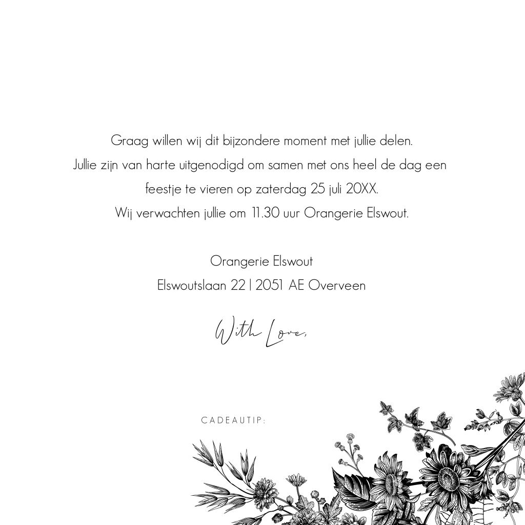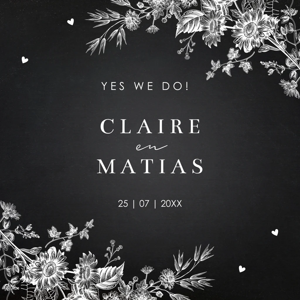 Trouwkaart zwart botanisch bloemenprint goudfolie