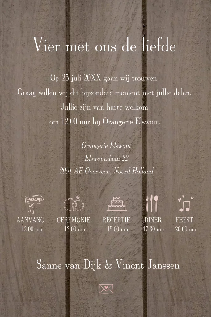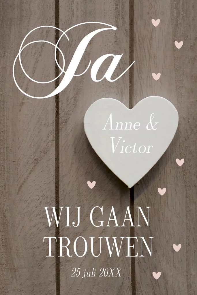 Rustieke trouwkaart bruin met houtlook en hartjes. Pas de kleur van de hartjes naar wens aan.