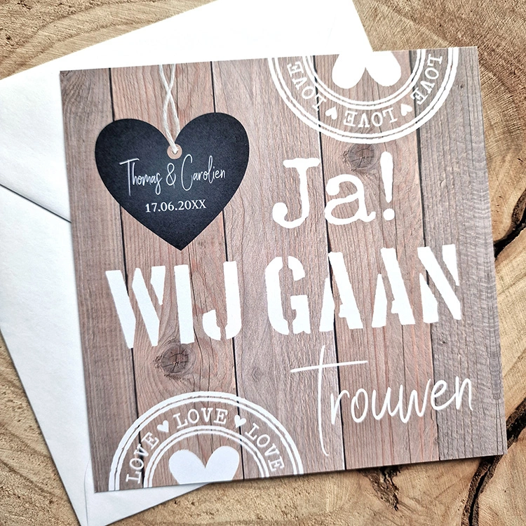 Rustieke en stoere trouwkaart bruin met houtlook, zwart hartje en stempels. In de binnenkant staan trouw symbolen en eigen foto.