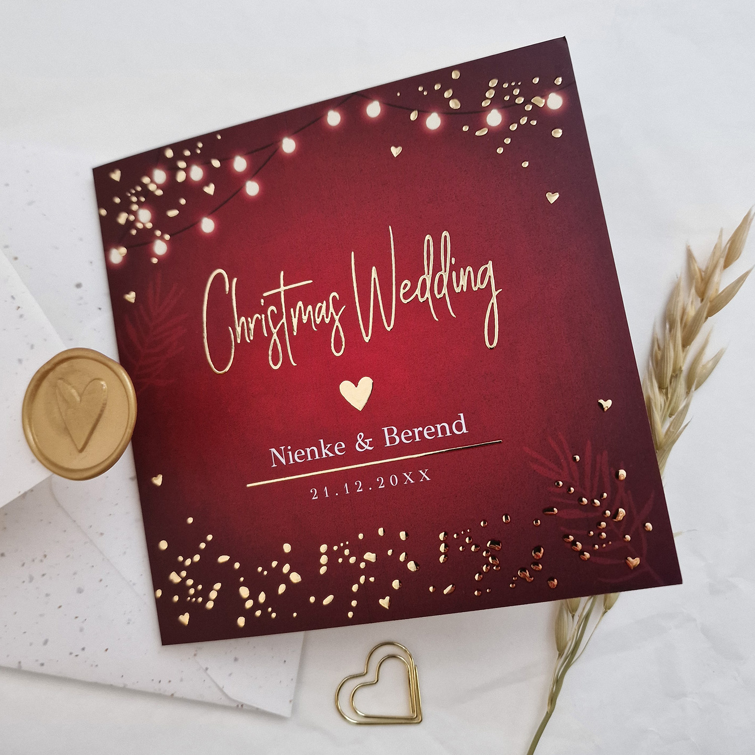 Trouwkaart rood Christmas Wedding kerst goudfolie lampjes