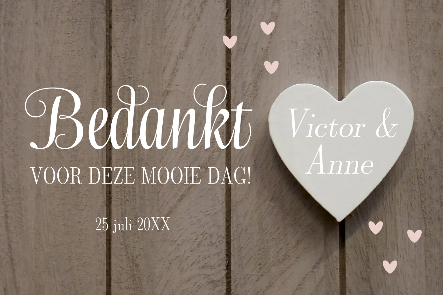 Rustieke bedankkaart huwelijk bruin met houtprint en hartjes. Bedank jullie gasten voor een onvergetelijke dag met deze prachtige bedankkaart.
