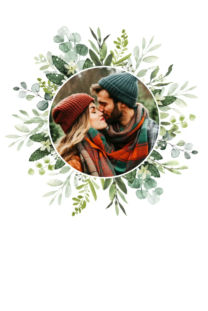 Save the date kaart wit met foto rond omringd door een krans van groene watercolour bladeren en goudfolie. Stuur deze mooie Save the Date kaart naar jullie gasten om de trouwdatum bekend te maken.