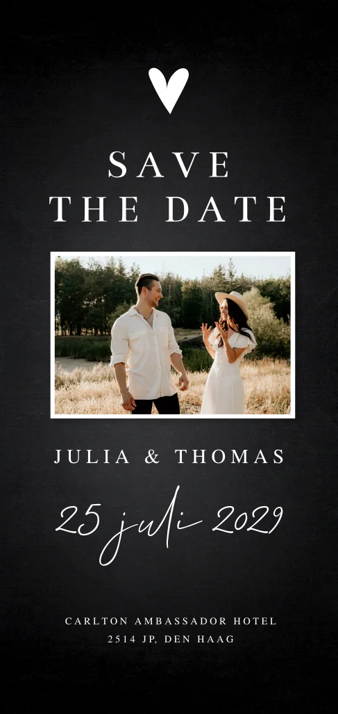 Save the date uitnodiging zwart langwerpig met foto en goudfolie. Maak jullie trouwdatum bekend met deze persoonlijke save the date!