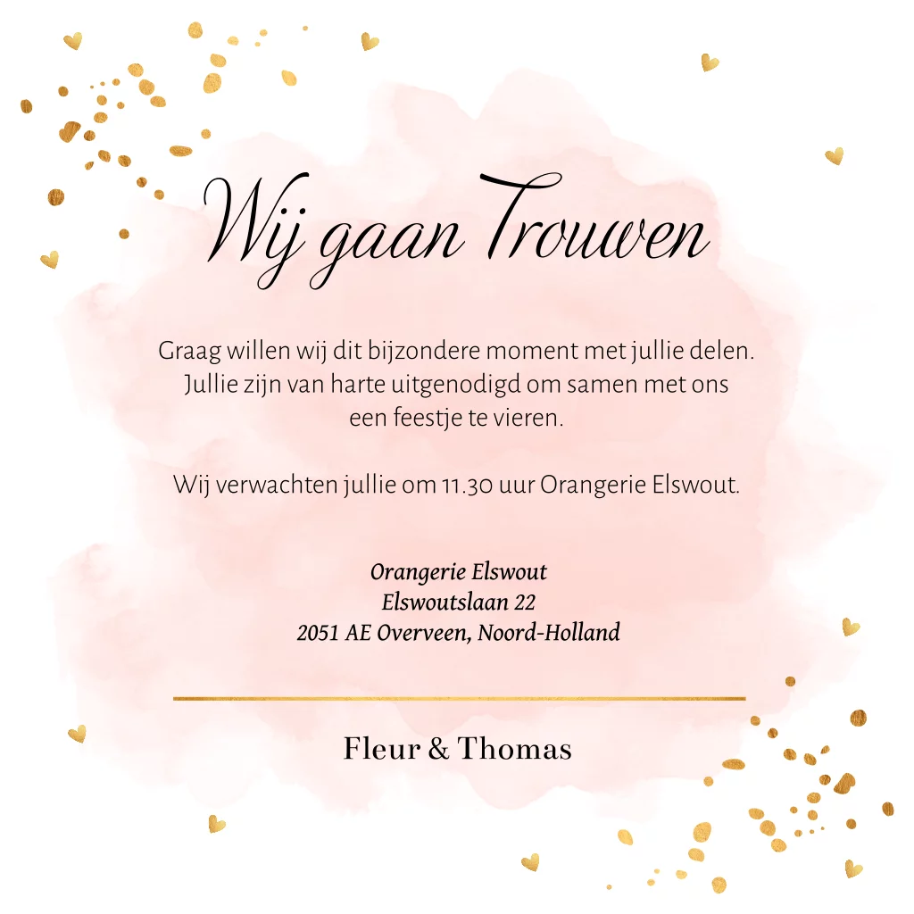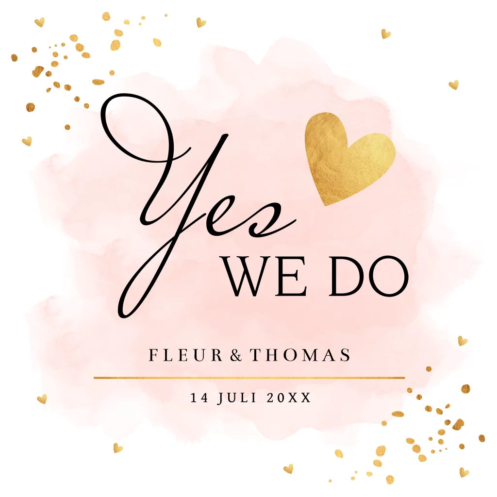 Mooie stijlvolle trouwkaart roze met watercolour, goudlook hartjes en tekst Yes we do!