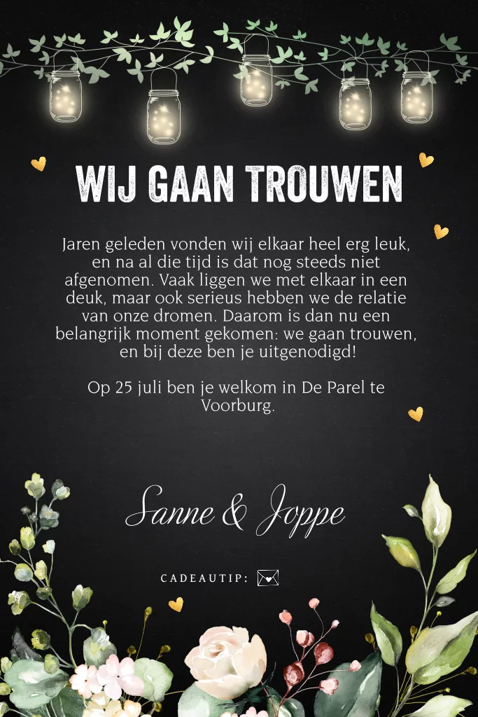 Trouwkaart zwart met wegwijzer bord hout, lampjes en bloemen. Nodig jullie gasten uit met deze mooie originele trouwkaart!