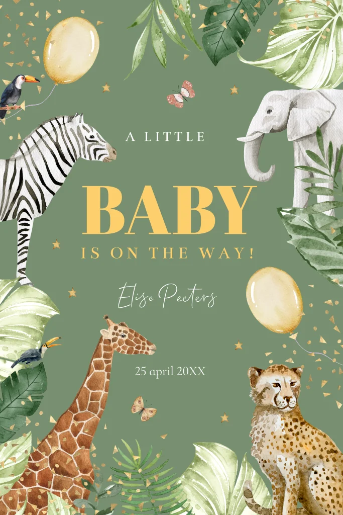 Organiseer jij binnenkort een babyshower? En wordt er een jongen verwacht? Nodig de gasten uit met deze leuke babyshower kaart met safari dieren en ballonnen. Pas het ontwerp naar wens aan in onze online editor.