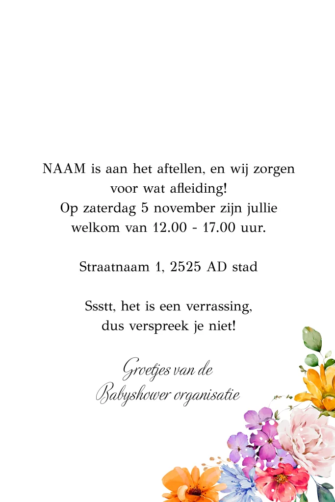 Babyshower uitnodiging met kleurrijke bloemen, roze waterverf en goudfolie.