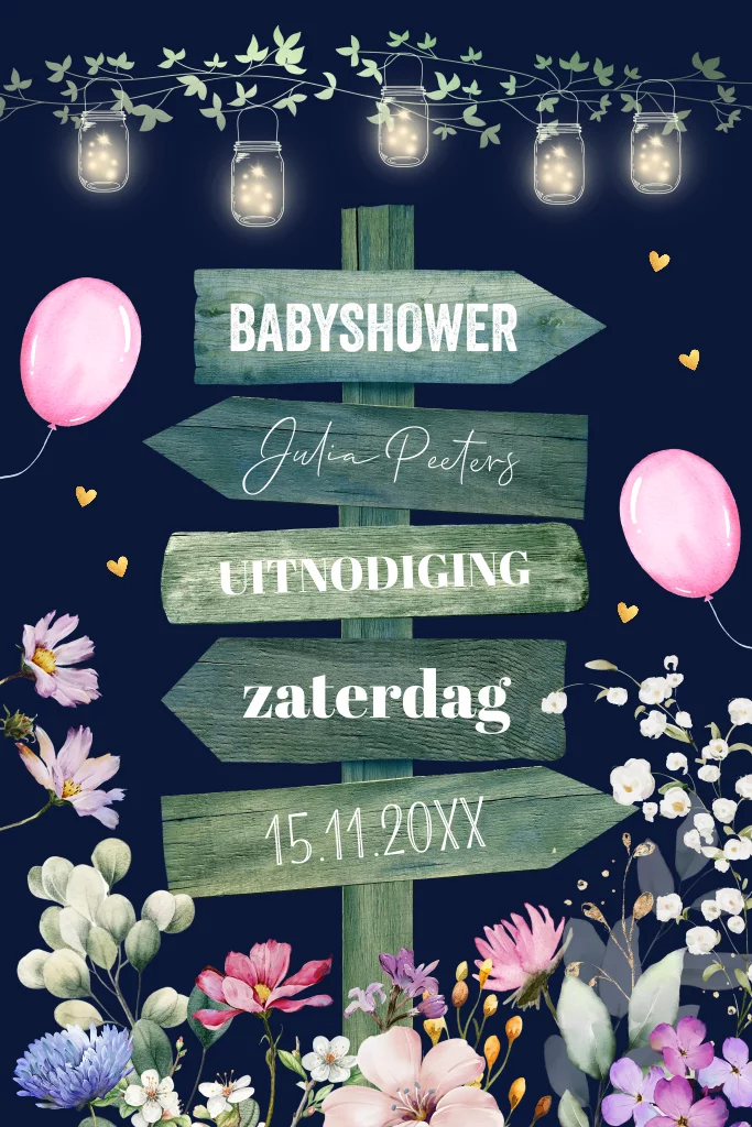 Babyshower uitnodiging met houten wegwijzer, bloemen, ballonnen en lampjes.