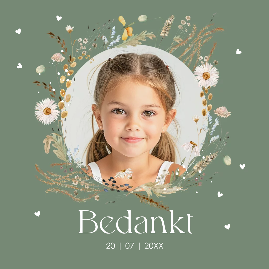Mooie bedankkaart communie groen met foto, bloemenkrans en goudfolie.