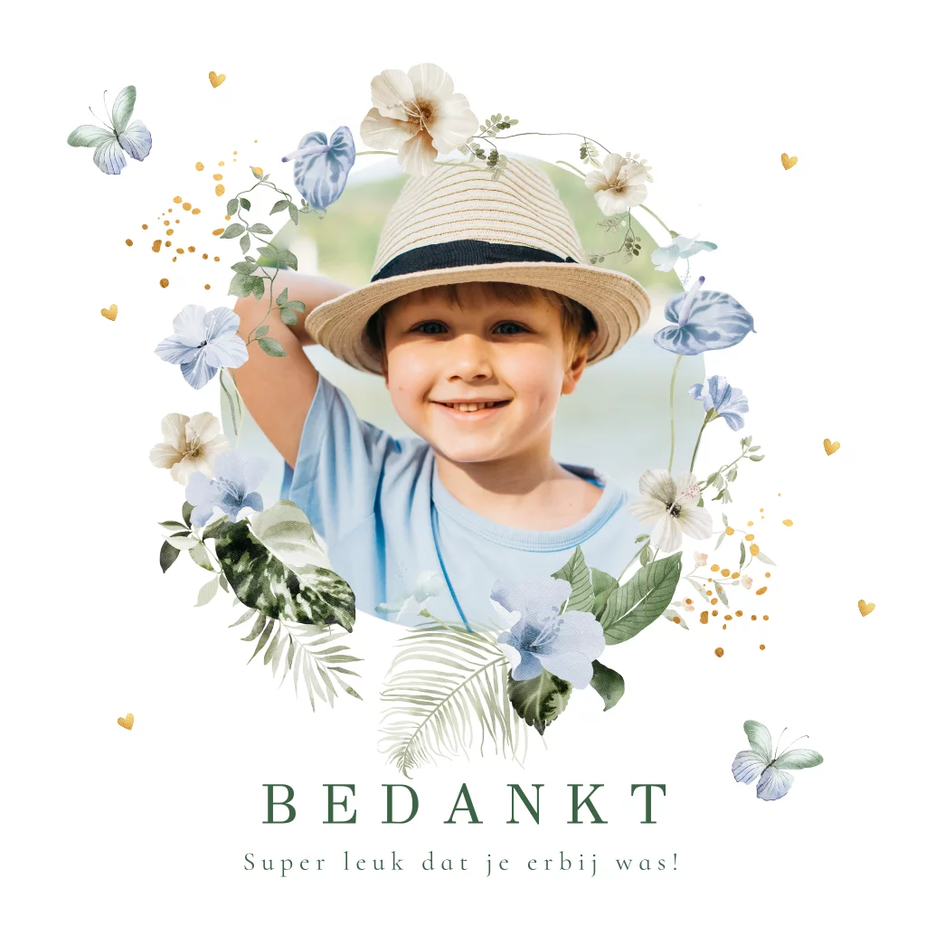Bedankkaart communie voor een jongen met foto, bloemen, bladeren en vlinders.