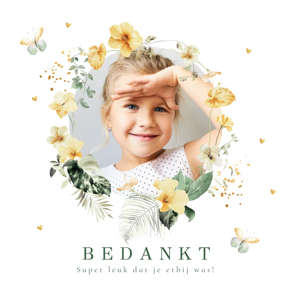 Bedankkaart communie voor een meisje met foto, bloemen en vlinders.