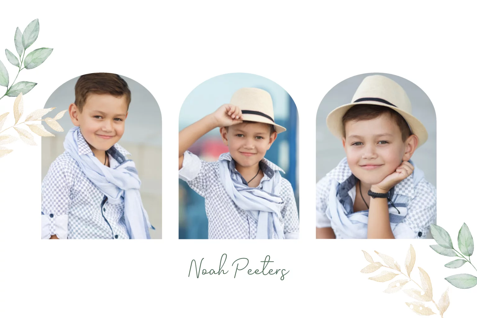 Bedankkaart communie voor een jongen met fotocollage, blaadjes en goudfolie. Voeg je allermooiste foto's toe en bedank je gasten voor een onvergetelijke dag!