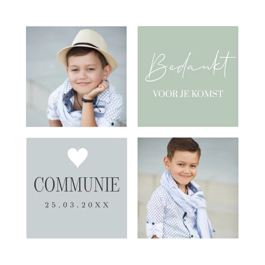 Bedankkaart communie voor een jongen met foto 's en groen grijze vlakken. Pas de kleur van de vlakken naar wens aan!