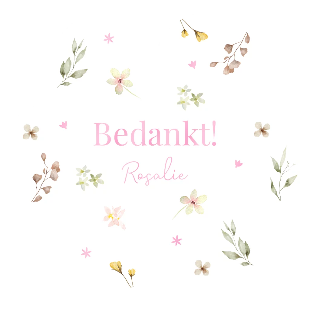 Bedankkaart communie voor een meisje in de vorm van een bloem met watercolour bloemen en roze hoogglans.
