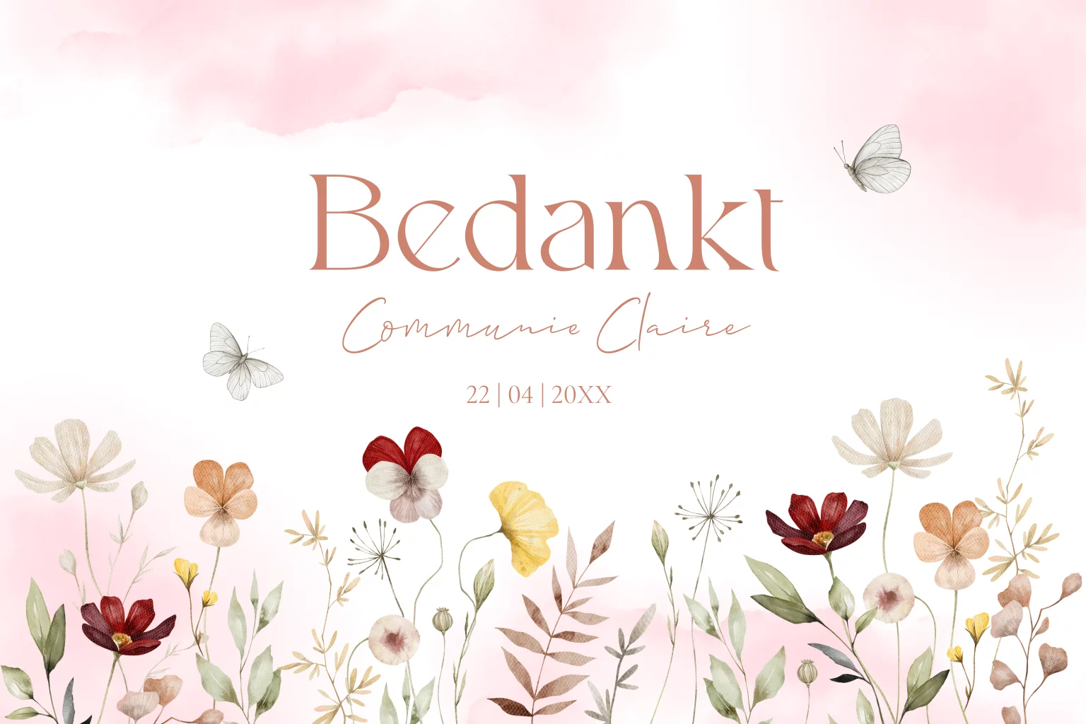 Bedankkaart communie voor een meisje met bloemen en waterverf roze.