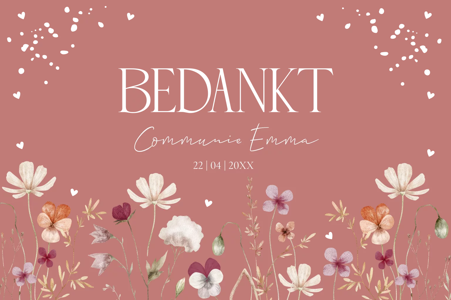 Bedankkaart communie voor een meisje met bloemen en waterverf roze en goudfolie.