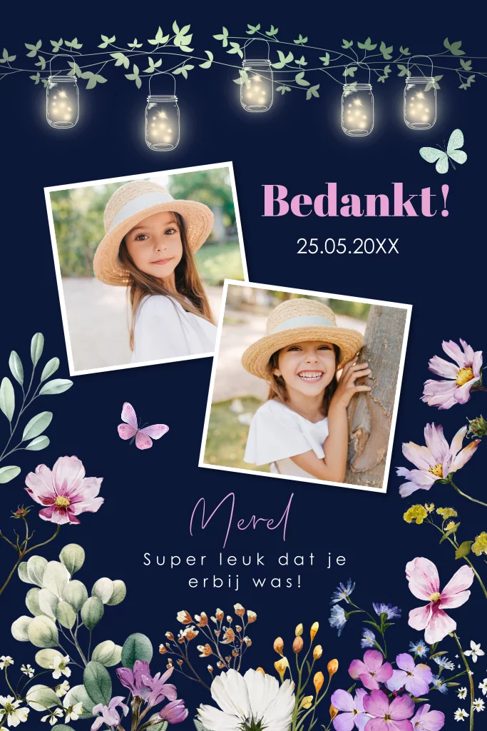 Bedankkaart communie donkerblauw voor een meisje met foto's, bloemen, bladeren en lampjes.