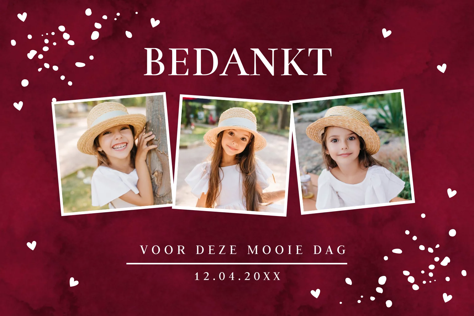 Bedankkaart communie voor een meisje rood met fotocollage en goudfolie.