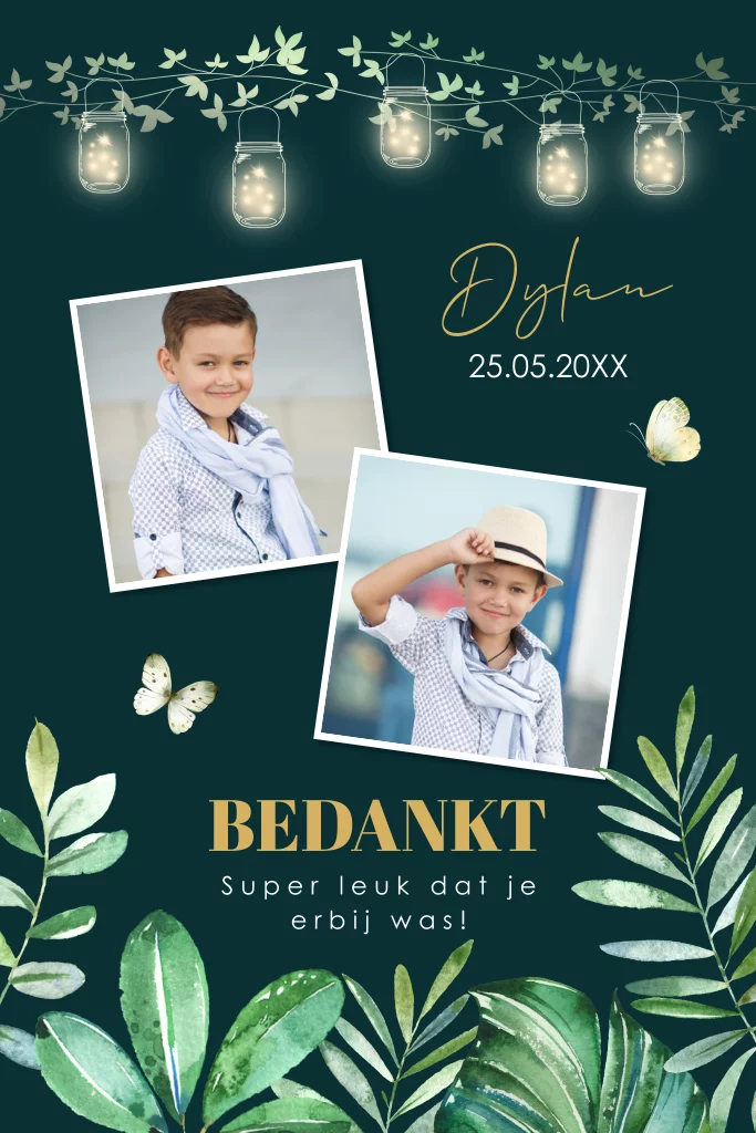 Bedankkaart voor een jongen donkerblauw met eigen foto's, groene bladeren, vlinders en lampjes.