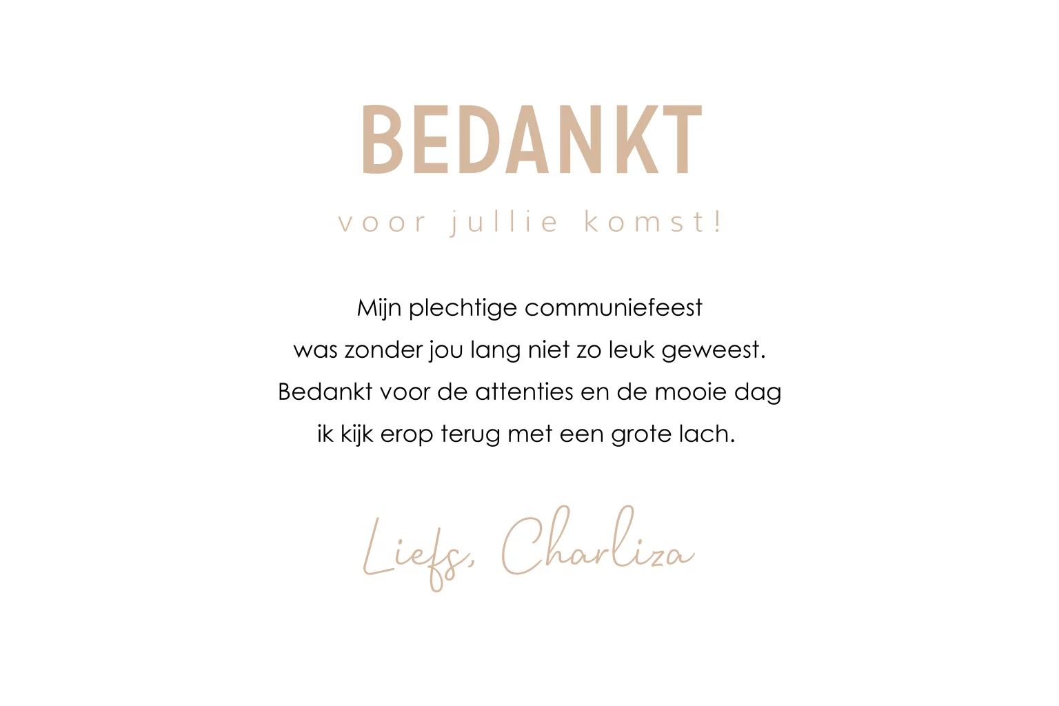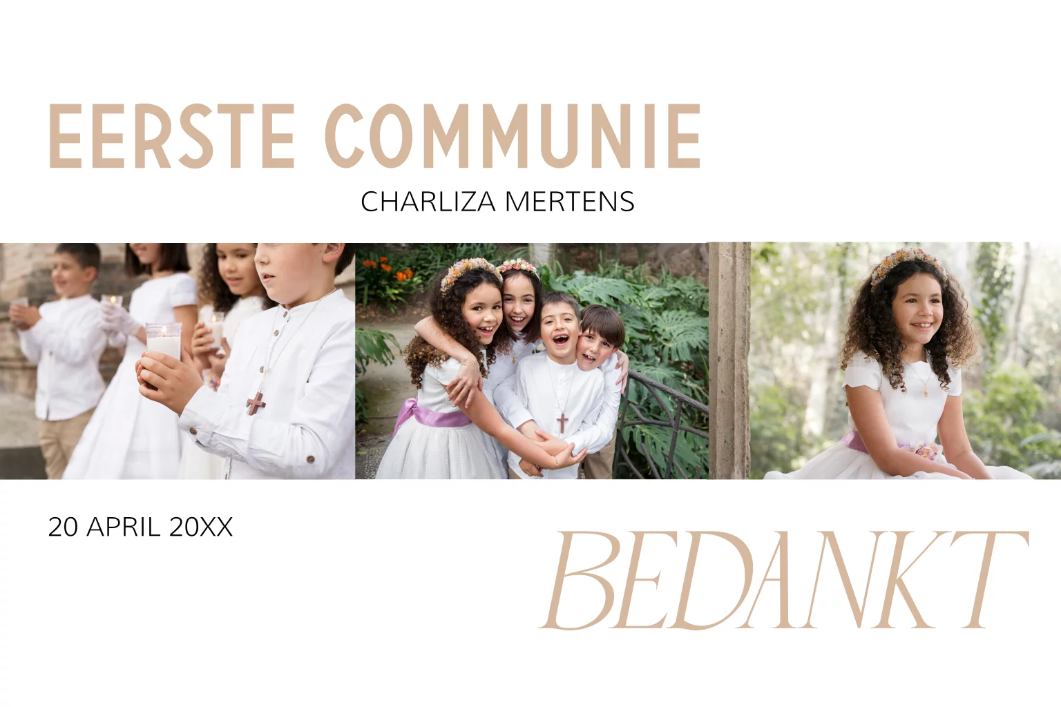 Bedankkaart eerste communie wit met fotocollage en mooie typografie beige.