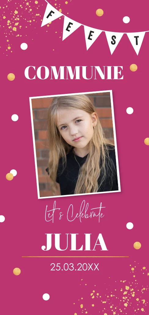 Communie uitnodiging voor een meisje roze met foto, goudlook dots en slinger.