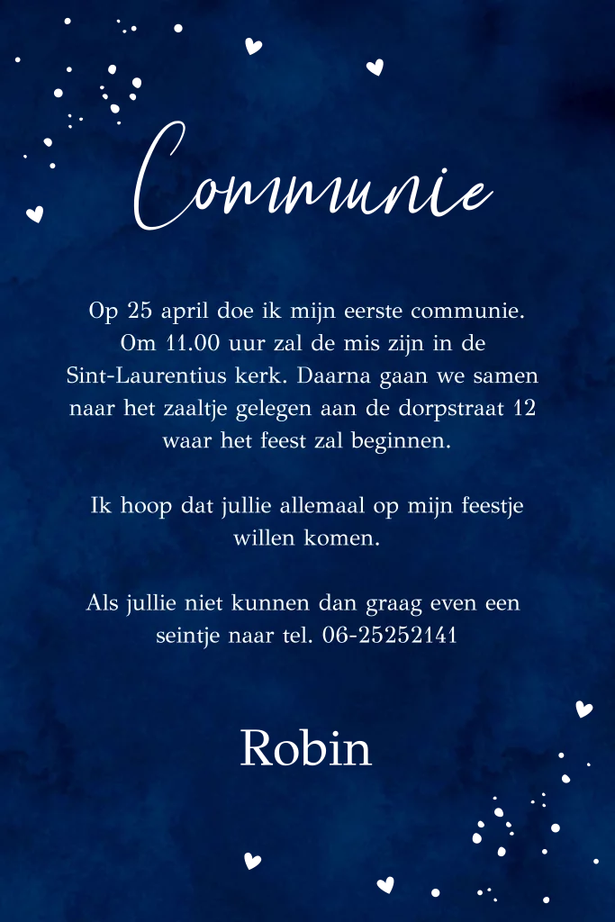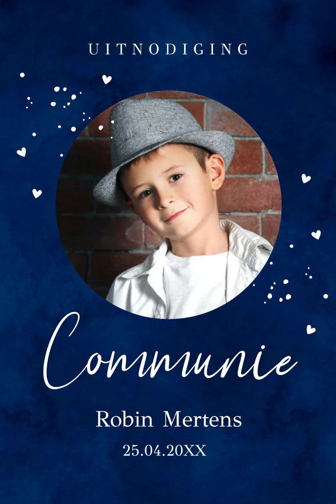 Op zoek naar een stijlvolle communie uitnodiging in blauw voor een jongen? Deze prachtige uitnodiging is perfect voor het vieren van deze bijzondere gelegenheid. Met een ronde foto en subtiele goudfolie accenten, straalt deze uitnodiging elegantie en klasse uit.
