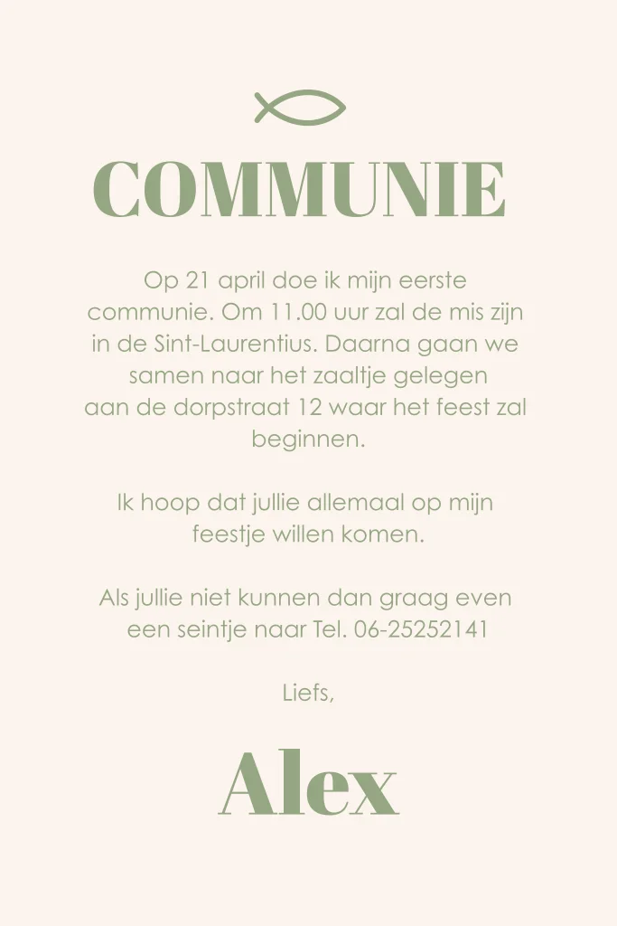Communie uitnodiging voor een jongen groen met Ichthus vis.