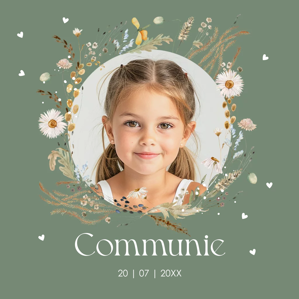 Communie uitnodiging groen voor een meisje met foto, bloemenkrans en goudfolie.
