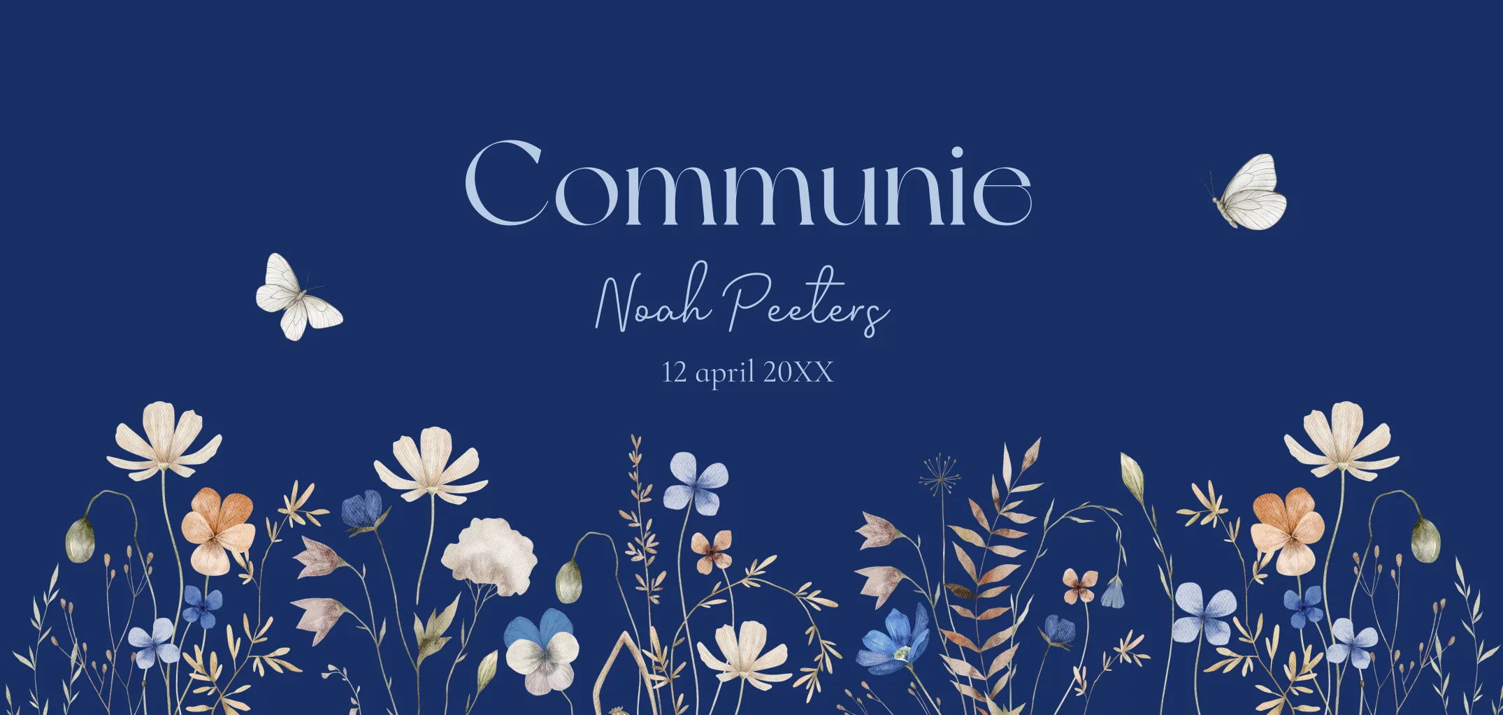 Communie uitnodiging voor een jongen blauw panorama met mooie veldbloemen en vlinders.
